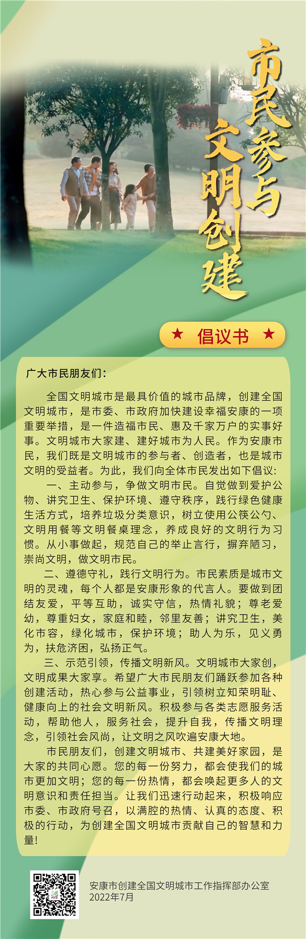 三、示范引領(lǐng),傳播文明新風(fēng)。文明城市大家創(chuàng),文明成果大家享。希望廣大市民朋友們踴躍參加各種創(chuàng)建活動,熱心參與公益事業(yè),引領(lǐng)樹立知榮明恥、健康向上的社會文明新風(fēng)。積極參與各類志愿服務(wù)活動,幫助他人,服務(wù)社會,提升自我,傳播文明理念,引領(lǐng)社會風(fēng)尚,讓文明之風(fēng)吹遍安康大地。?
