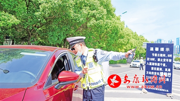 5月1日,在瀛湖快速干道與三橋北交匯路口,漢濱交警大隊(duì)民警為游客介紹前往瀛湖景區(qū)情況。汪海玉 攝