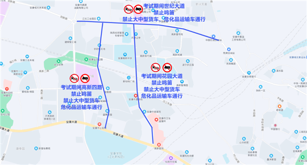 1、花園大道(安康大道至世紀(jì)大道)、世紀(jì)大道(新路口環(huán)島至五路口環(huán)島)、高新四路,所有通行車輛于6月6日21時(shí)至6月8日21時(shí),無(wú)論遇到何種情況,一律禁止鳴笛,禁止大中型貨車、?;愤\(yùn)輸車通行。