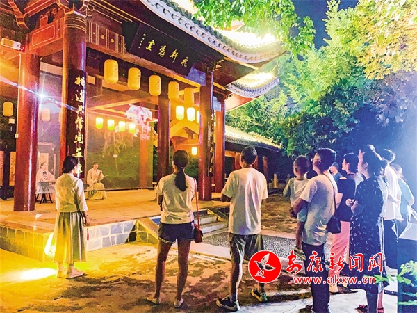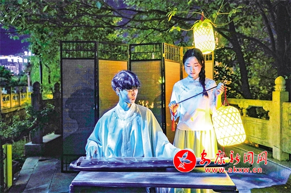 還未走近安瀾樓,就被一首琵琶曲改編的絲竹樂(lè)曲《春江花月夜》吸引,流暢多變的節(jié)奏,巧妙細(xì)膩的配器,絲絲入扣的演奏,仿佛將觀眾帶入那個(gè)月夜春江的迷人景色。環(huán)繞安瀾樓四周,畫家楊炳昌筆下的金州八景,仿佛一秒穿越古今,勝景徐徐、浮現(xiàn)腦際。