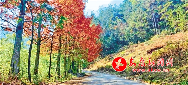 車子沿著山路繼續(xù)往上,途中時(shí)不時(shí)掠過一排排水杉,水杉的顏色有綠有黃、有深有淺,高大挺拔、直入云端。偶爾有幾棵同類型品種夾雜其中,已全然呈現(xiàn)出上下一體的棕黃色。在太陽的照射下,仿佛是身披金黃鎧甲的戰(zhàn)士,堅(jiān)韌有力。枝葉在微風(fēng)中輕搖,沙沙地響,視聽一體的感覺,不覺教人沉醉其中。