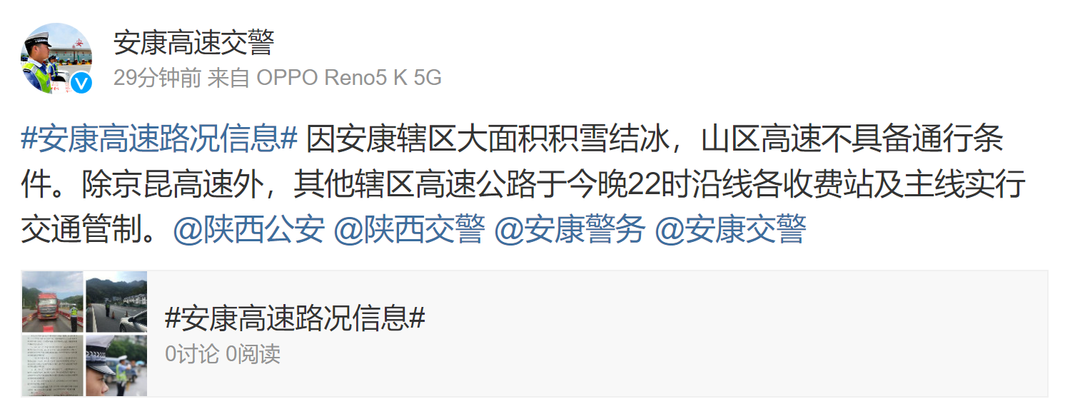 據(jù)安康高速交警消息:因安康轄區(qū)大面積積雪結(jié)冰,山區(qū)高速不具備通行條件。除京昆高速外,其他轄區(qū)高速公路于今晚(2月22日)10時(shí)沿線各收費(fèi)站及主線實(shí)行交通管制。?