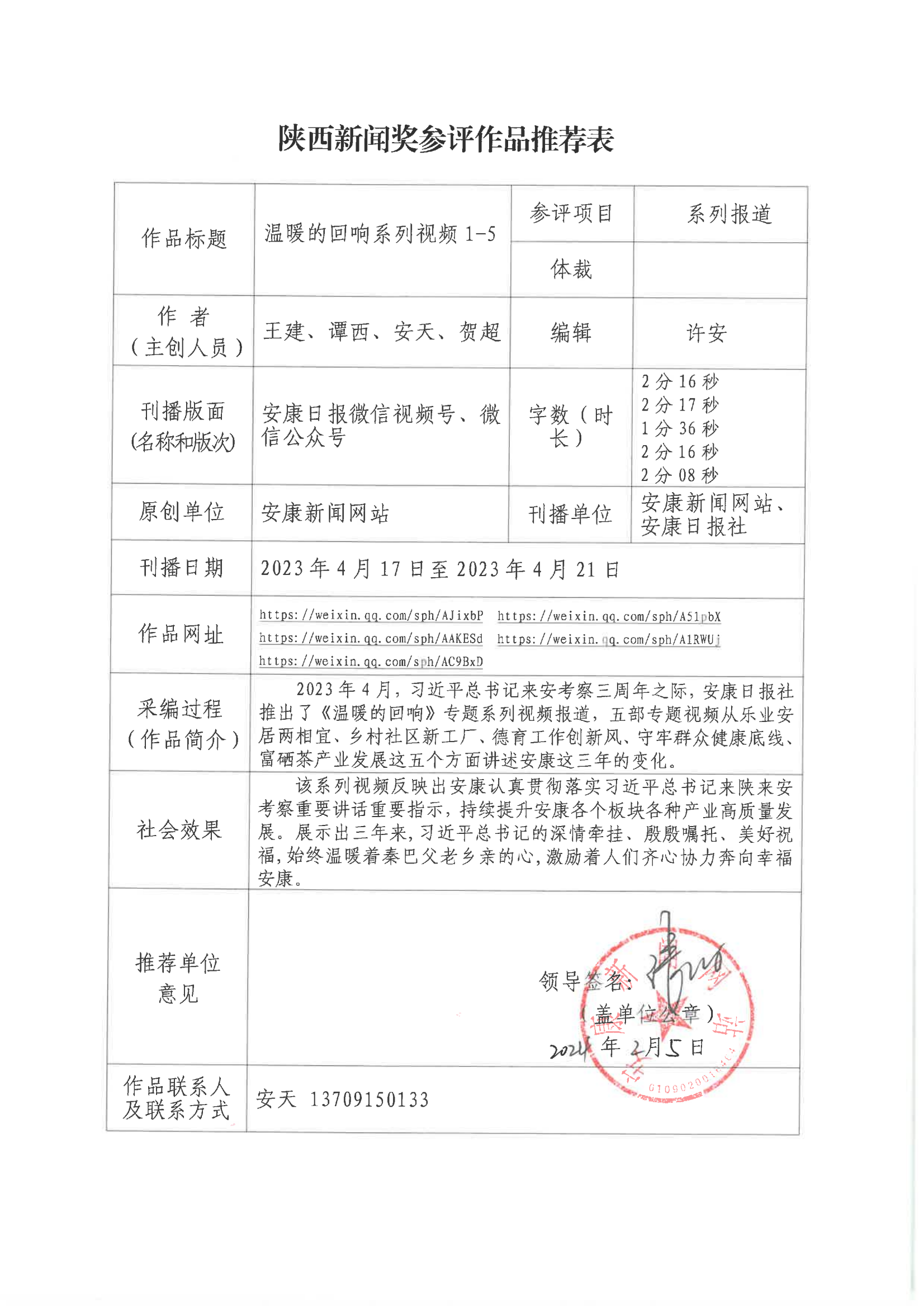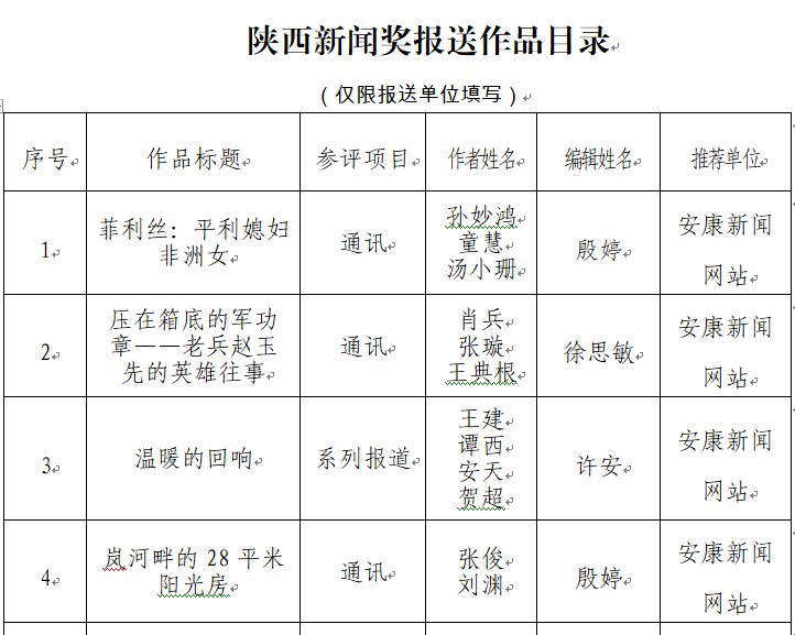 經(jīng)過1月30日編委會推薦、社黨委研究決定,擬推薦以下4件新聞作品參評2023年度“陜西新聞獎”。公示時間從2024年3月6日至2024年3月12日,公示期為5個工作日。如有不同意見,請向安康日報社機(jī)關(guān)紀(jì)委、新聞管理部反映。