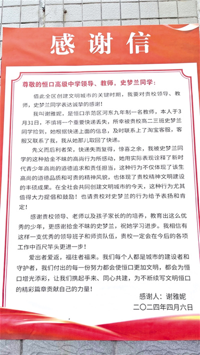 小城大愛,溫暖無處不在。近日,在恒口高級(jí)中學(xué),河?xùn)|九年制學(xué)校教師謝雅妮給該校學(xué)生史夢蘭送來了一封暖意融融的感謝信,向她拾金不昧的行為表示感謝,也為學(xué)校的德育工作點(diǎn)贊。
