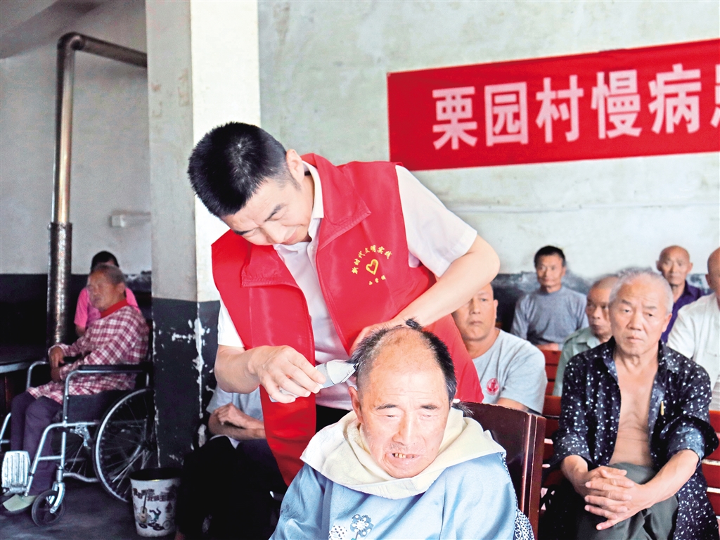 為弘揚中華民族“孝老、敬老、愛老”傳統(tǒng)美德,8月7日,白河縣西營鎮(zhèn)機關(guān)黨支部組織黨員來到西營鎮(zhèn)區(qū)域敬老院開展“弘揚孝義善舉 倡導(dǎo)文明鄉(xiāng)風(fēng)”志愿服務(wù)活動?;顒又?,志愿者們?yōu)槔先藗兲峁┝烁啐g補貼認證、修剪指甲、打掃衛(wèi)生等志愿服務(wù)。(劉焱 胡曉華 攝)