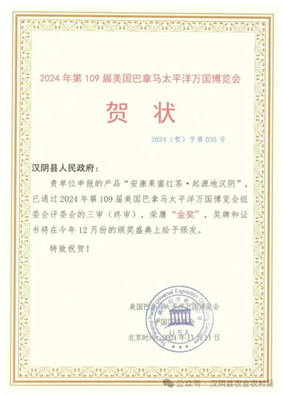“安康果蜜紅·起源地漢陰”榮獲美國(guó)巴拿馬萬(wàn)國(guó)博覽會(huì)金獎(jiǎng)