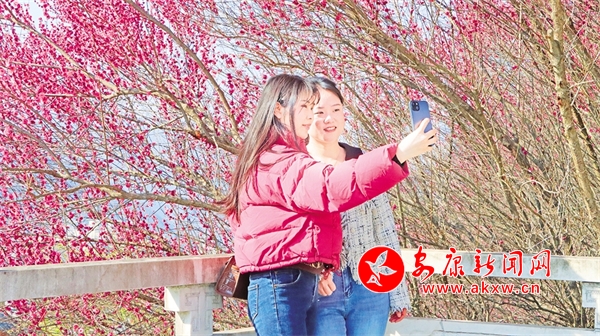 石泉縣濱江大道上紅梅競(jìng)相綻放,廣大游客駐足觀看,打卡留念。譚文昌 攝?