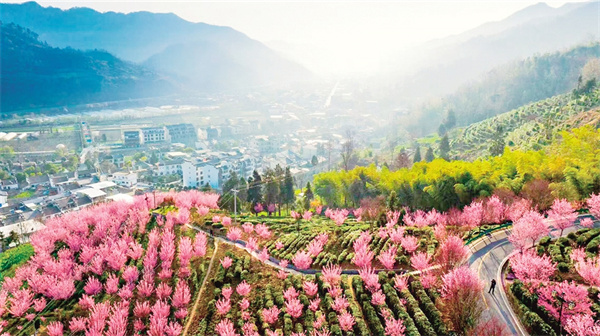 沿著茶山步道拾級而上,茶農采青的竹簍與游人拍照的紗巾在梯田間次第閃現(xiàn)。粉白相間的梅花如云絮般綴滿枝頭,風過處,花瓣簌簌落入茶叢,為嫩綠的新芽染上淡淡馨香。遠處黛瓦白墻的徽派民居與近處起伏的茶壟構成天然畫框,無人機視角下,蜿蜒的茶道如同玉帶纏繞山腰,將紅楓、櫻花、梅林串成斑斕的珠鏈。