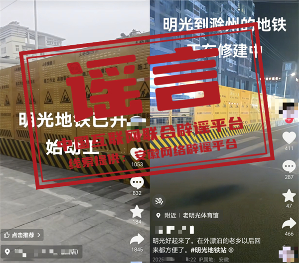 真相:近日,網民“張**”“沙**”等發(fā)布視頻,編造并傳播“明光地鐵已開始動工”相關虛假信息,并配以誤導性視頻,引發(fā)關注和討論。經核實,相關視頻內容對應區(qū)域施工項目并非修建地鐵,網傳視頻系謠言。明光市委網信辦和市公安局已依法對張某、沙某等進行批評教育,并要求其刪除相關不實信息。(來源:“安徽省互聯(lián)網違法和不良信息舉報”微信公眾號、明光市委網信辦)