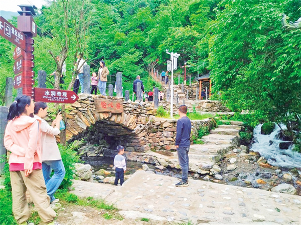 2020年以來,雙河鎮(zhèn)黨委、政府以市場化改革破題,號召在外創(chuàng)業(yè)能人陳守林等人回鄉(xiāng)協(xié)助開發(fā)水洞溝?!耙屬Y源變資產(chǎn),首先得打通‘任督二脈’?!标愂亓纸榻B說:“雙河鎮(zhèn)政府累計投入資金800余萬元,治理景區(qū)河道6公里、鋪設石板步道4.5公里、搭建石拱橋6座,新建多處公廁,并完善停車場、旅游標識系統(tǒng)等配套基礎設施?!边@一系列舉措讓“養(yǎng)在深閨”的水洞溝景區(qū),蛻變?yōu)榭蛇M入、可游覽、可消費的旅游目的地。