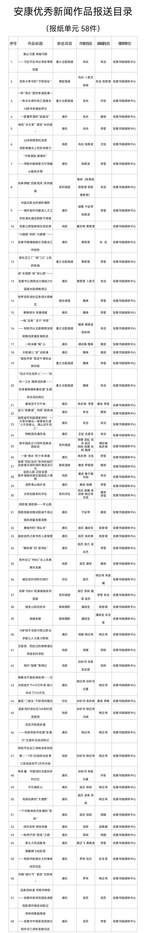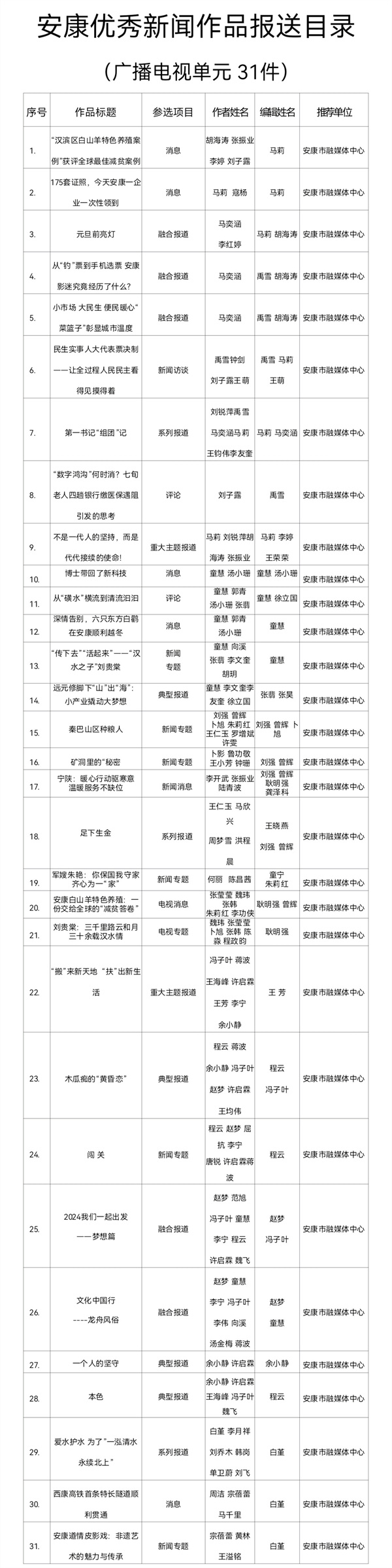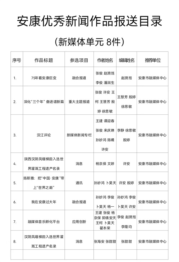 根據(jù)《關(guān)于開(kāi)展2024年度安康優(yōu)秀新聞作品、安康市優(yōu)秀新聞工作者推選工作的通知》(安記協(xié)〔2025〕04號(hào))文件要求,經(jīng)推薦、領(lǐng)導(dǎo)審核,安康市融媒體中心推薦參評(píng)2024年度安康優(yōu)秀新聞作品97件(報(bào)紙單元58件,廣播電視單元31件,新媒體單元8件)?,F(xiàn)將報(bào)送作品目錄(詳見(jiàn)附件)予以公示。