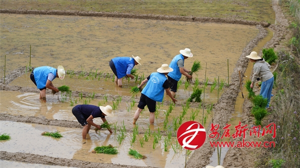 6月5日,走進(jìn)城關(guān)鎮(zhèn)漁灣村麻莊組,一片熱火朝天的農(nóng)忙景象映入眼簾。農(nóng)技人員與農(nóng)戶們并肩作戰(zhàn),共同進(jìn)行水稻插秧作業(yè)。劃線分區(qū)、精準(zhǔn)配肥、均勻撒肥、有序插秧……每一項(xiàng)工作都進(jìn)行得有條不紊,大家分工明確、配合默契,田間地頭處處洋溢著忙碌而歡快的氣息。