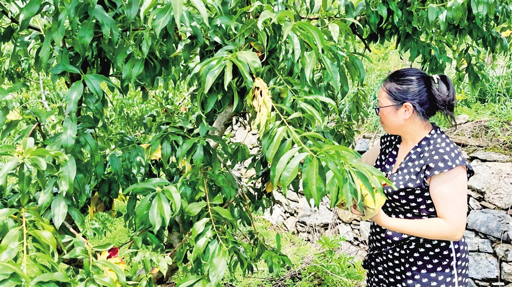 穿過(guò)村莊,山坡上500畝桃園綠意盎然?;刎?fù)責(zé)人伍娟與工人正采摘套袋。“2017年建設(shè)的桃園,今年雖受旱情影響,產(chǎn)量仍達(dá)30萬(wàn)斤,產(chǎn)值約300萬(wàn)元?!?o:p>