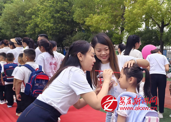 走紅毯環(huán)節(jié)將氛圍推向高潮。班主任帶領(lǐng)新生與家長(zhǎng)手牽手緩緩前行,周?chē)臍g呼聲此起彼伏,孩子們?cè)谶@份熱鬧中,真切感受到“成為小學(xué)生”的榮譽(yù)感?!懊6Y”環(huán)節(jié)巧思滿(mǎn)滿(mǎn),8種寓意吉祥的物品整齊擺放,孩子們懷著好奇伸手觸摸,在指尖的互動(dòng)中,收下滿(mǎn)含期許的祝福。