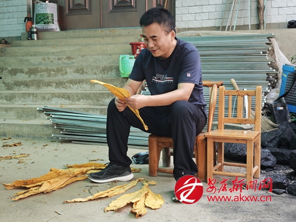△ 趙灣鎮(zhèn)黨委書(shū)記劉孝勇查看烤煙成色