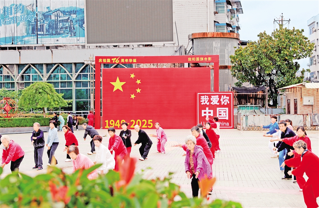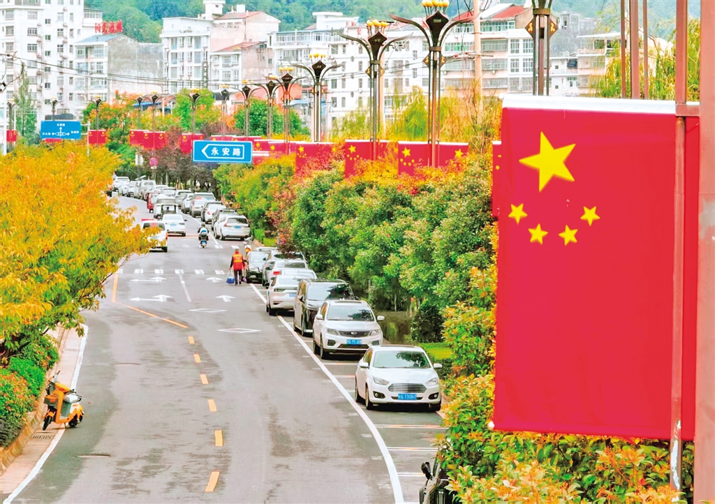 紫陽城區(qū)的街頭巷尾,一面面鮮艷的五星紅旗迎風(fēng)招展,處處洋溢著祥和的節(jié)日氛圍。?葉明星 攝