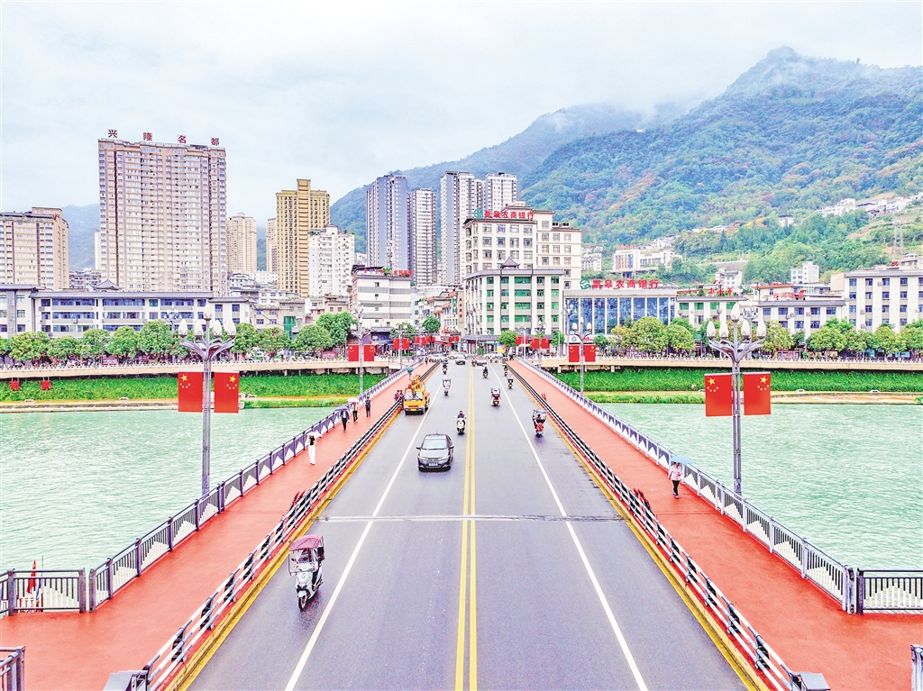 在嵐皋縣大橋兩側(cè),一面面整齊的五星紅旗迎風(fēng)飄揚,喜迎國慶。?李王灝 攝