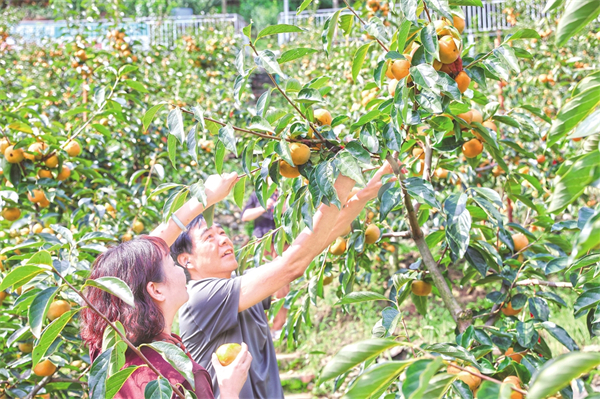 10月8日,游客在石泉縣城關(guān)鎮(zhèn)絲銀壩村脆甜柿子果園體驗(yàn)采摘樂趣。許兵 攝