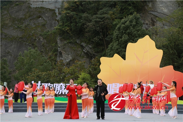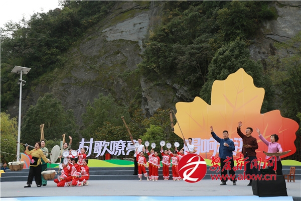 金秋時節(jié)的茨溝鎮(zhèn),萬畝紅葉、層林盡染。伴隨著歡快的鑼鼓聲,茨溝鎮(zhèn)、五里鎮(zhèn)、譚壩鎮(zhèn)三支隊伍輪番登場,不僅獻(xiàn)唱原創(chuàng)村歌,還展示特色產(chǎn)業(yè)、優(yōu)質(zhì)資源與地方文化,紛紛亮出獨具特色的“看家絕活兒”。歌伴舞《村歌飛揚》《松壩謠》《幸福歌兒唱起來》唱出了鄉(xiāng)親們的幸福生活;以修建八一水庫為背景的安康歌謠《我來了》引發(fā)會場共鳴;民俗表演《龍的傳人》則將節(jié)目推向高潮。舞蹈、鄉(xiāng)村T臺秀、民俗表演、八岔戲等節(jié)目,或以傳統(tǒng)幽默詼諧的風(fēng)格,或以深情敘述的方式,展現(xiàn)鄉(xiāng)村新生活,為觀眾獻(xiàn)上一場別開生面的視聽盛宴,現(xiàn)場歡呼聲此起彼伏。