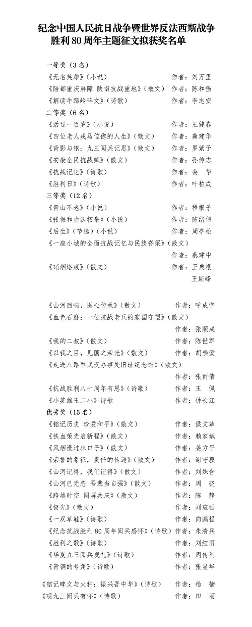 紀念中國人民抗日戰(zhàn)爭暨世界反法西斯戰(zhàn)爭勝利80周年主題征文評審結果公示