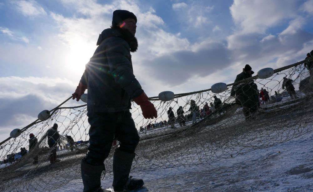 ??2026年1月7日,漁民們將漁網(wǎng)拖出查干湖冰面。
