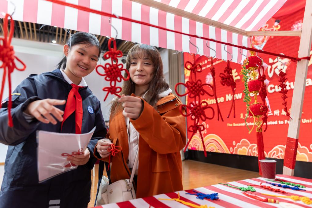 2024年1月28日,復(fù)旦大學(xué)第二附屬學(xué)校學(xué)生(左)為美國(guó)馬斯卡廷中學(xué)學(xué)生(右)介紹中國(guó)結(jié)。新華社記者 王翔 攝