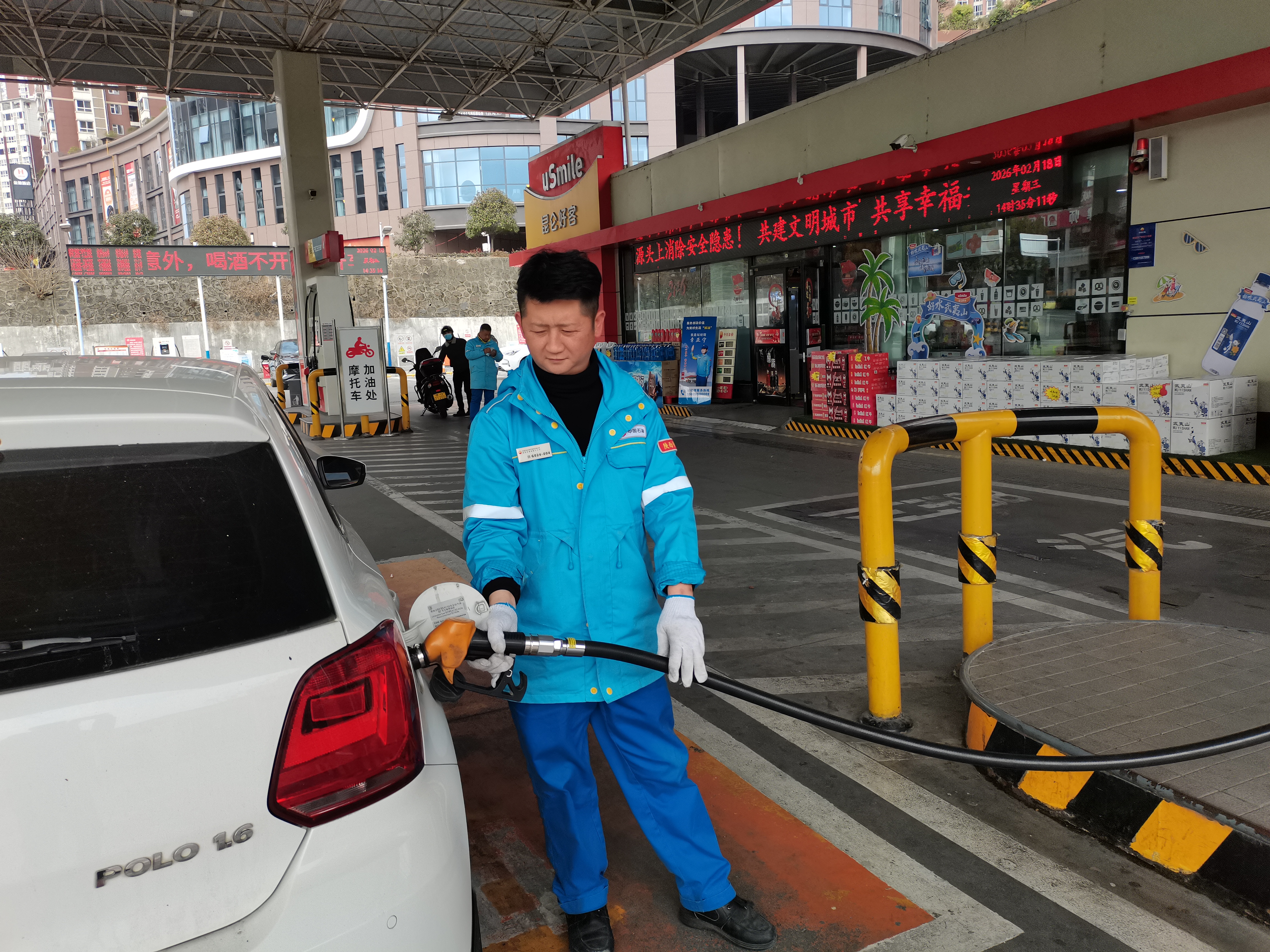 春節(jié)期間,中國石油安康分公司做好服務(wù)保障工作。圖為2月18日,安康西津漢江大橋附近加油站加油員在崗值守。陳榮斌 攝