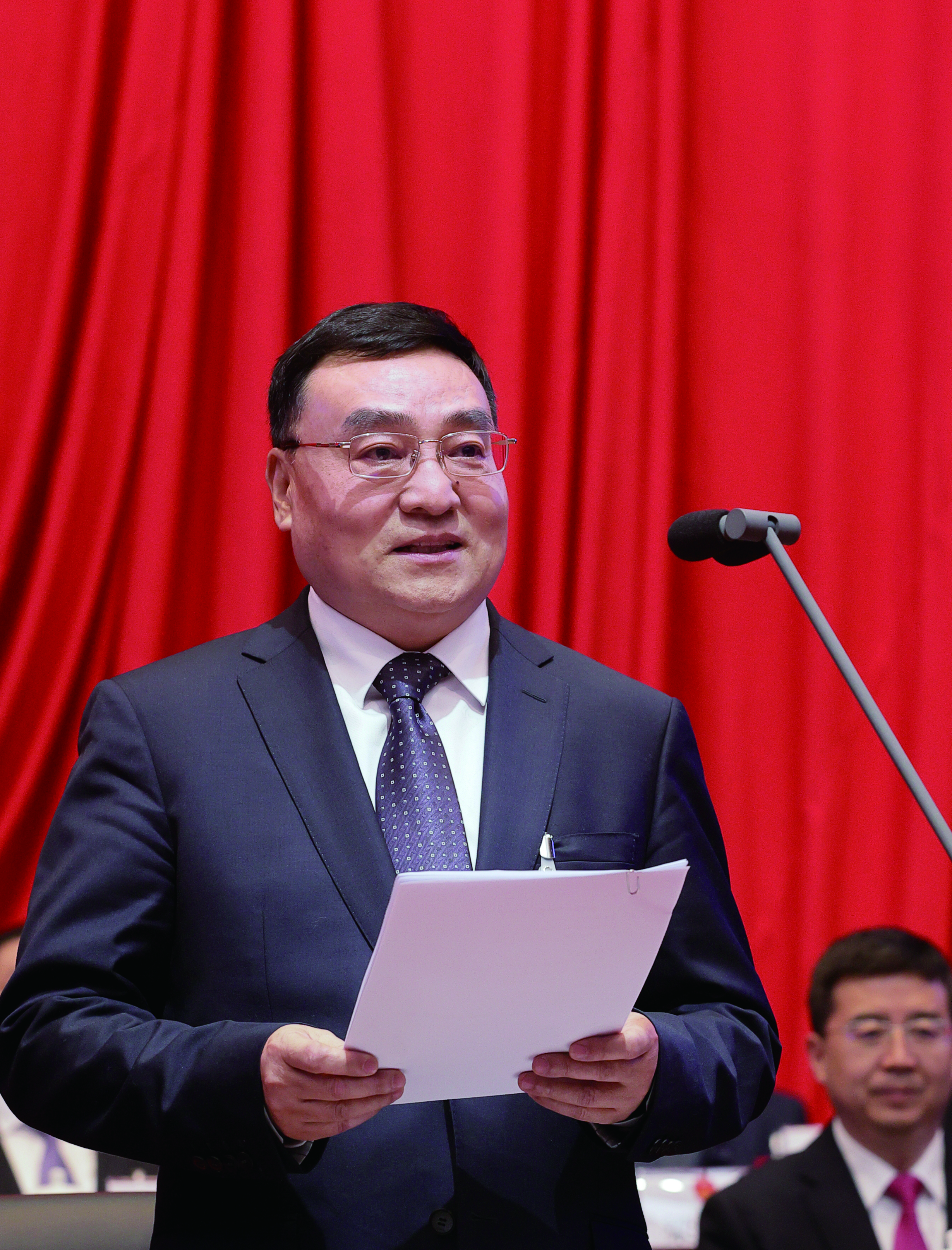 會場氣氛莊重而熱烈,主席臺帷幕正中高懸的國徽在鮮艷的紅旗映襯下熠熠生輝。主席臺對面懸掛“牢記囑托、勇?lián)姑?、開拓創(chuàng)新、拼搏奮進(jìn),為在中國式現(xiàn)代化道路上聚力建設(shè)幸福安康不懈奮斗!”的橫幅,鼓舞人心、催人奮進(jìn)。