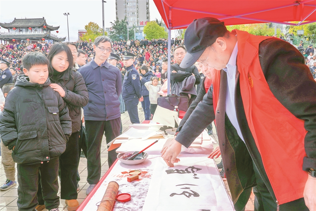 市集不僅有宣傳與服務(wù),更有可看可學(xué)的文明實(shí)踐?;顒?dòng)通過宣傳展板集中展示漢濱區(qū)移風(fēng)易俗成果與文明新風(fēng)先進(jìn)典型事跡,用身邊人、身邊事帶動(dòng)群眾。非遺代表性傳承人現(xiàn)場詮釋勤儉美德,書法愛好者現(xiàn)場書寫福字與家訓(xùn),讓群眾在傳統(tǒng)文化熏陶中,潛移默化地接受新風(fēng)教育?!胺沁z、書法和移風(fēng)易俗結(jié)合得好,孩子也能受教育。”帶著孩子逛市集的市民李女士收獲滿滿、笑意盈盈。