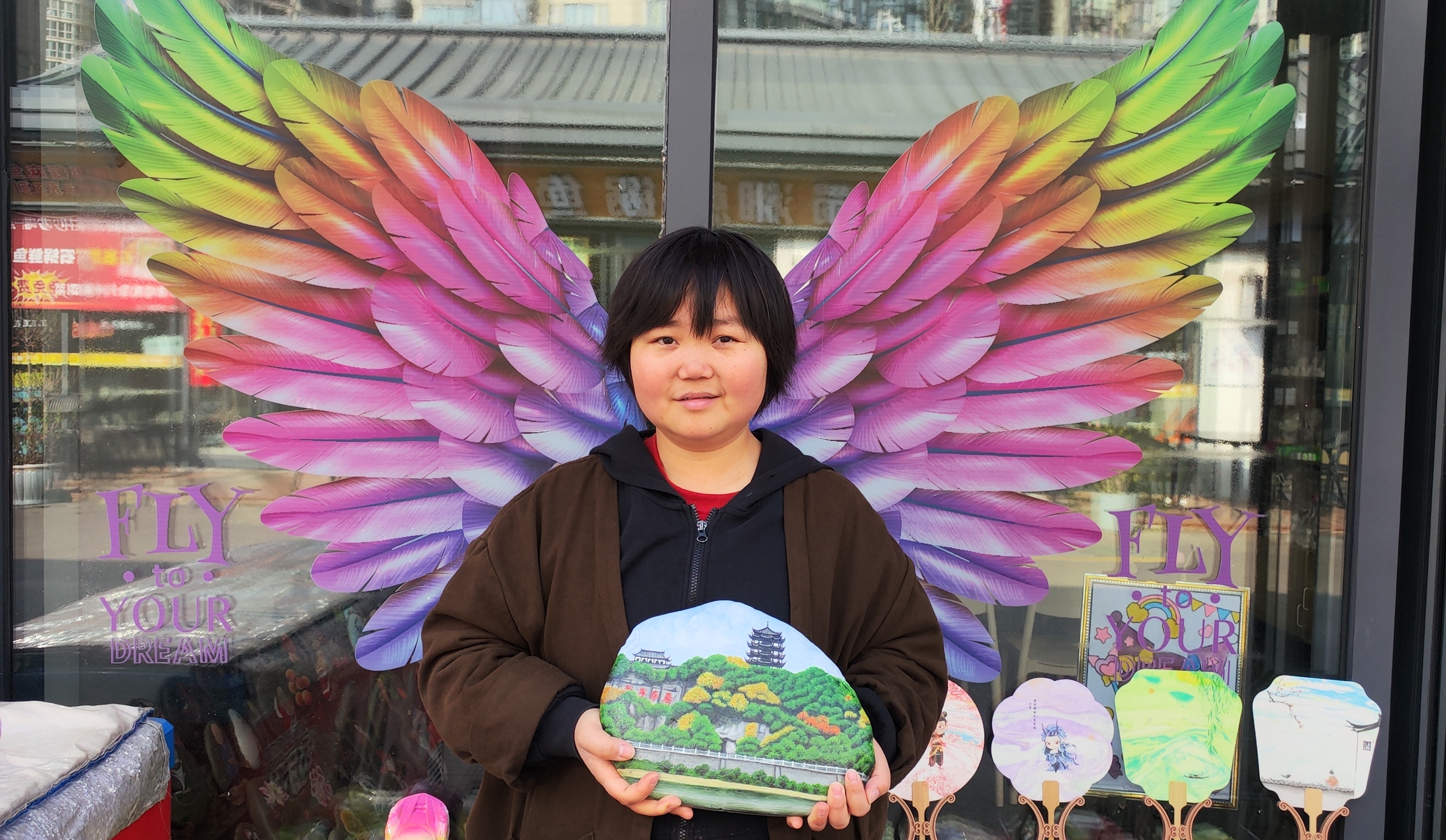 在她店鋪門口的玻璃柜上,貼著一雙展開的彩翼,手捧石頭畫的李景麗,眼神明亮、笑容溫婉,恰似破繭重生的蝴蝶,歷經(jīng)風(fēng)雨洗禮,依舊振翅翱翔,用手中的畫筆續(xù)寫著屬于自己的芳華,也用堅(jiān)韌與熱愛,詮釋著新時代普通人不屈不撓、逐光前行的精神力量。