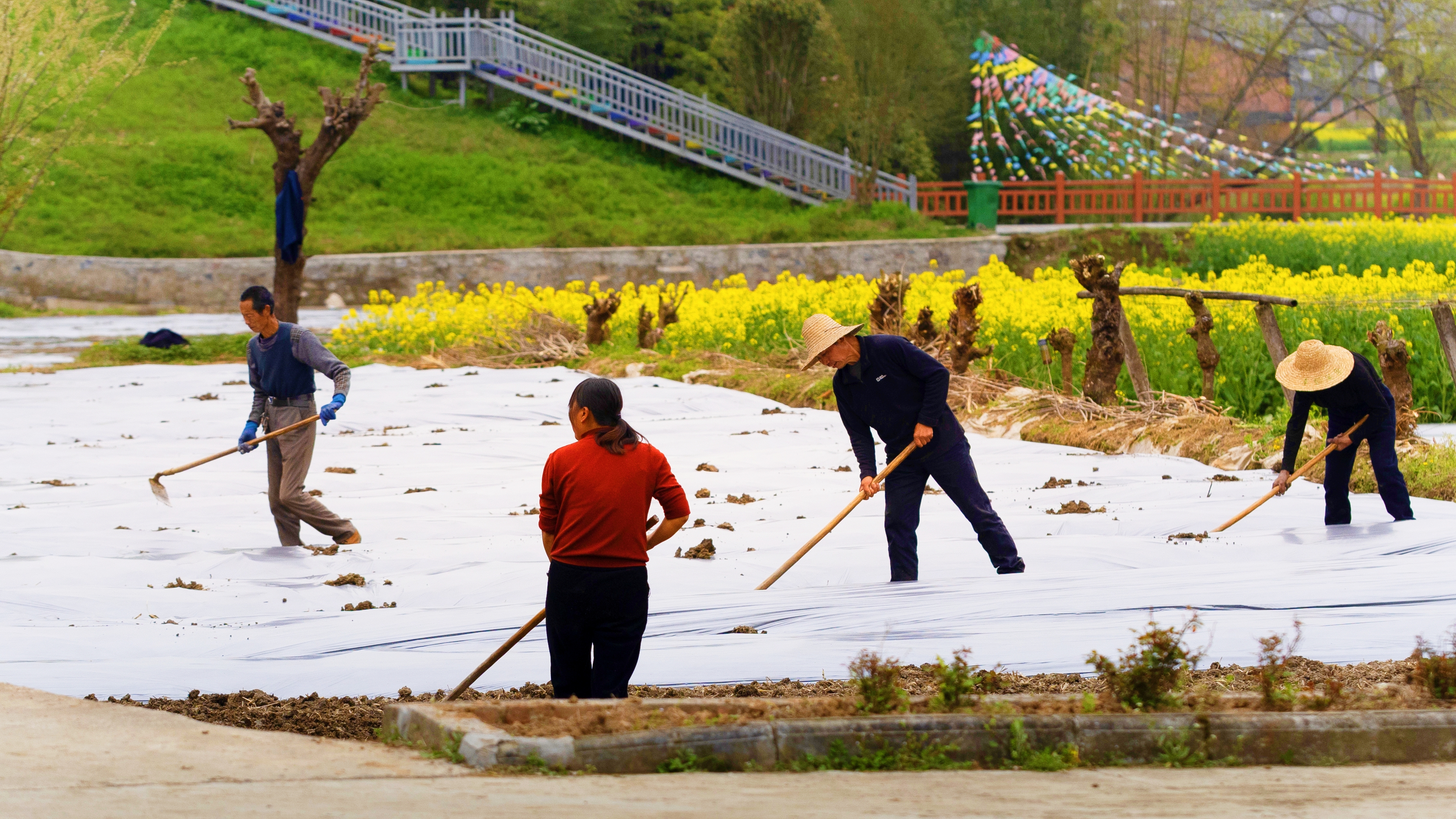 花海之上風(fēng)光旖旎,花海之下農(nóng)事正忙。趁著晴好天氣,當(dāng)?shù)剞r(nóng)戶搶抓春耕有利時節(jié),田間地頭一派熱火朝天的忙碌景象。大家分工協(xié)作、有條不紊,忙著起壟整地、鋪設(shè)地膜,為紫長茄子移栽做前期準備工作。