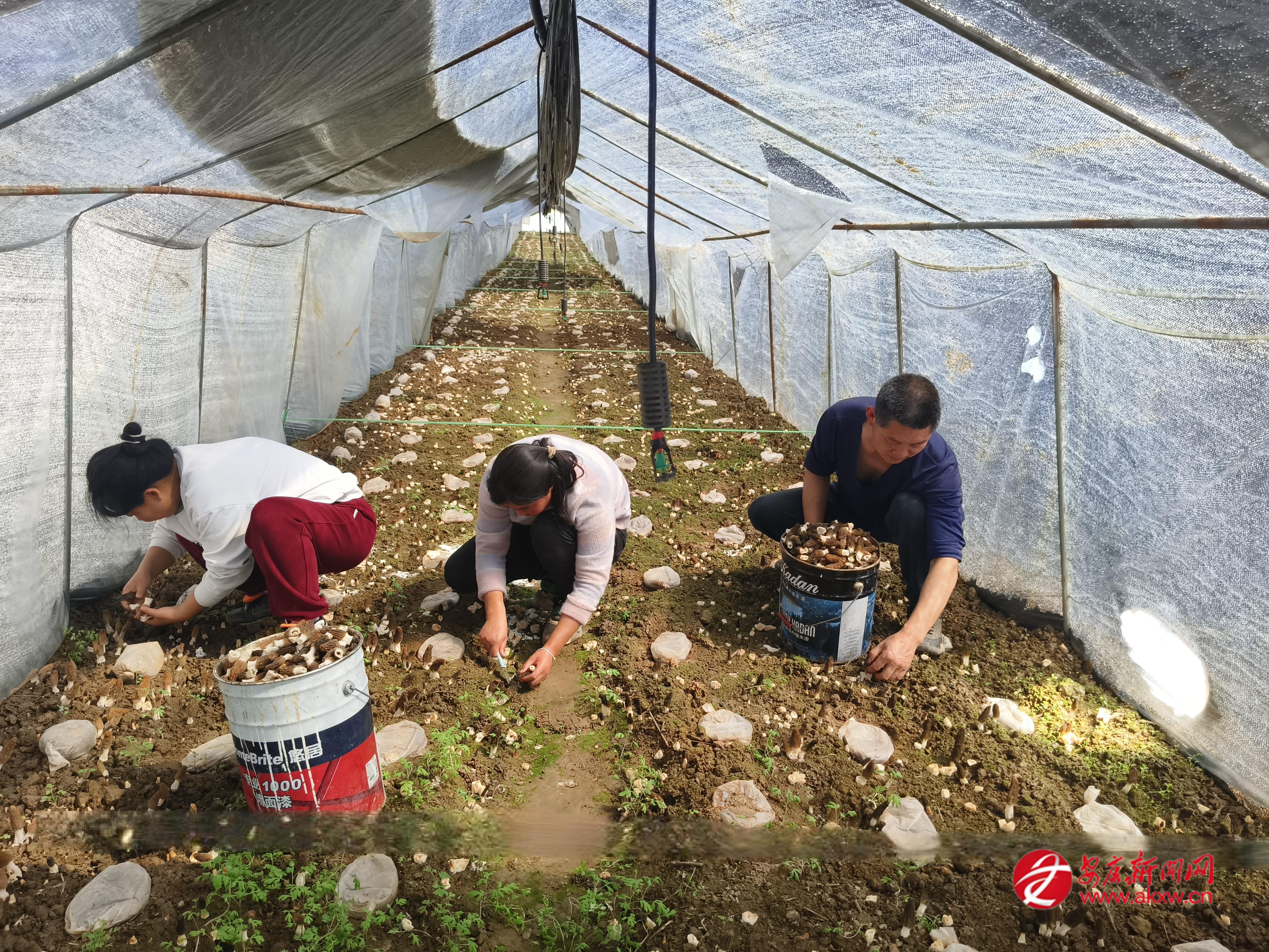 江口鎮(zhèn)欣蕊羊肚菌農(nóng)業(yè)技術(shù)開發(fā)家庭農(nóng)場內(nèi),工人正在采摘羊肚菌。