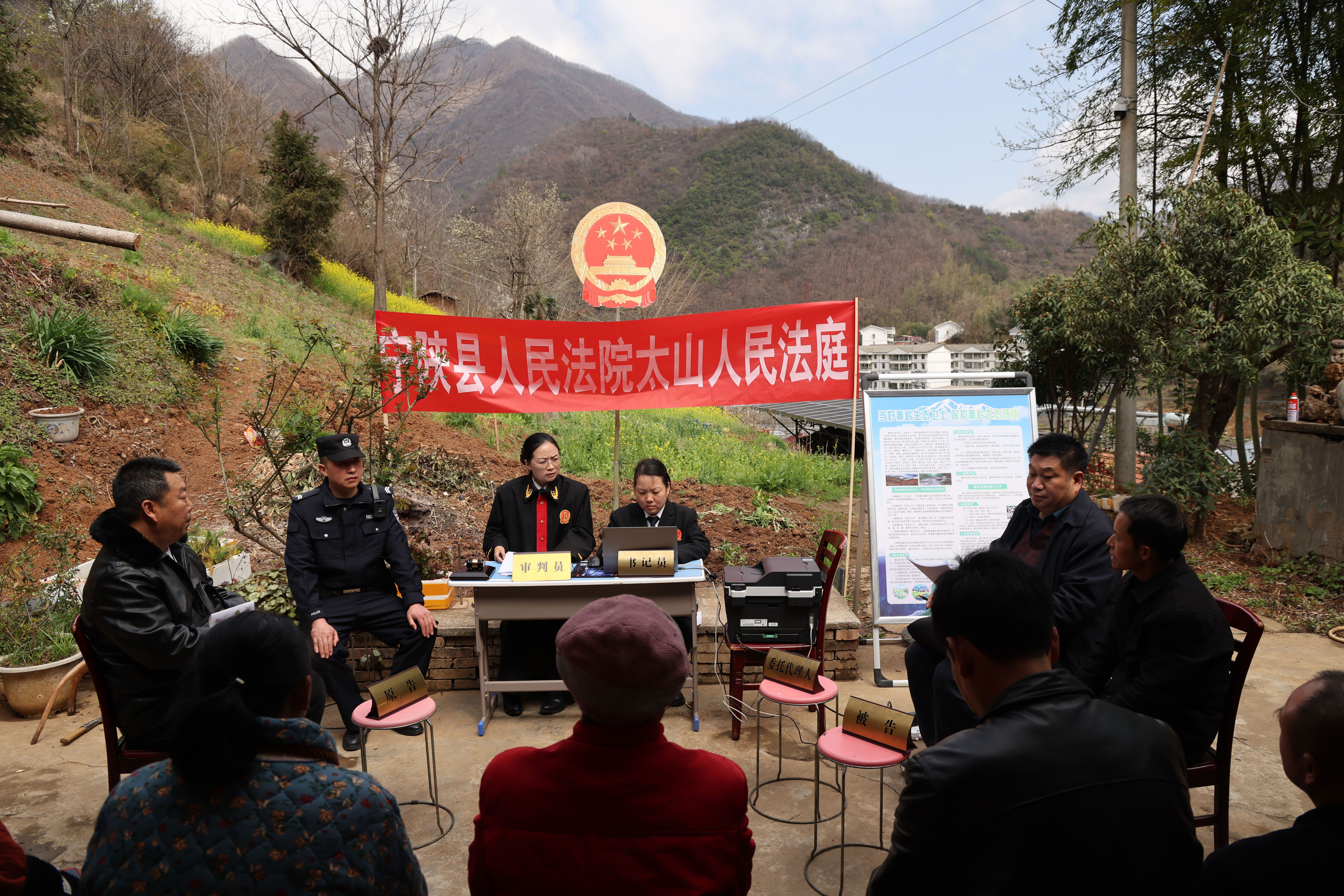 3月24日,在寧陜縣龍王鎮(zhèn)永紅村的田埂旁,金燦燦的花海映襯著莊嚴(yán)的國(guó)徽更顯熠熠生輝。寧陜縣人民法院就地審理一起排除妨害糾紛案件,成功化解了鄰里之間的多年積怨,真正實(shí)現(xiàn)案結(jié)、事了、人和。
