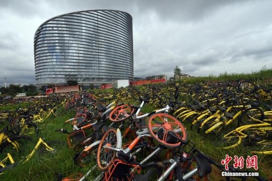 9月9日,現(xiàn)場堆積如山的共享單車。近半年來,位于昆明市盤龍區(qū)的閑置荒地里堆放了大量的共享單車,數(shù)量已超萬輛。中新社記者 李進(jìn)紅 攝