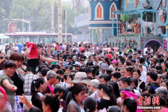 9月15日,商戶聚集在北京天意商城門(mén)口甩賣(mài)商品,吸引大批顧客搶購(gòu)。天意商城是北京規(guī)模最大的小商品批發(fā)兼零售市場(chǎng),為疏解北京非首都功能,天意商城將于9月16日關(guān)門(mén)停業(yè)。中新社記者 盛佳鵬 攝