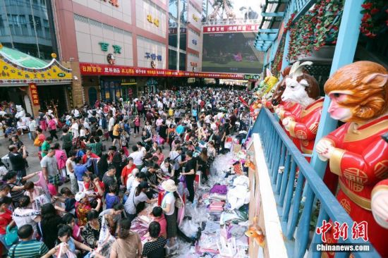 9月15日,商戶在北京天意商城甩賣(mài)商品,吸引大批顧客搶購(gòu)。天意商城是北京規(guī)模最大的小商品批發(fā)兼零售市場(chǎng),為疏解北京非首都功能,天意商城將于9月16日關(guān)門(mén)停業(yè)。中新社記者 盛佳鵬 攝