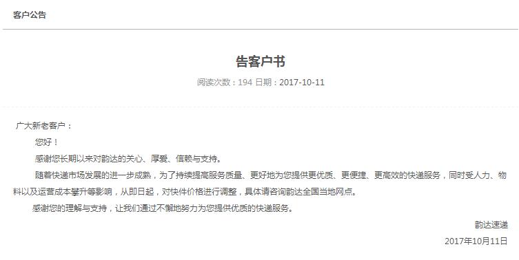 10月11日,韻達快遞官網(wǎng)發(fā)布《告客戶書》,表示為提供更優(yōu)質(zhì)、更便捷、更高效的快遞服務(wù),同時受人力、物料以及運營成本攀升等影響,從即日起,對快件價格進行調(diào)整,具體請咨詢韻達全國當(dāng)?shù)鼐W(wǎng)點。