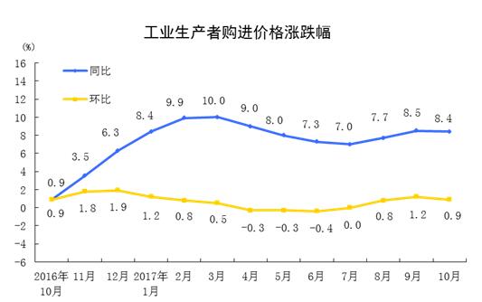人民網(wǎng)北京11月9日電(李楠樺)國(guó)家統(tǒng)計(jì)局官方網(wǎng)站公布數(shù)據(jù)顯示,2017年10月份,全國(guó)工業(yè)生產(chǎn)者出廠價(jià)格同比上漲6.9%,環(huán)比上漲0.7%。工業(yè)生產(chǎn)者購(gòu)進(jìn)價(jià)格同比上漲8.4%,環(huán)比上漲0.9%。1-10月平均,工業(yè)生產(chǎn)者出廠價(jià)格同比上漲6.5%,工業(yè)生產(chǎn)者購(gòu)進(jìn)價(jià)格同比上漲8.4%。qYM安康新聞網(wǎng)