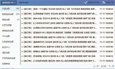 “一開始我還跟他們講,你們就不要問了,直接發(fā)朋友圈吧!”黃平說,“后來實(shí)在回復(fù)不過來,只好設(shè)置了自動(dòng)回復(fù),‘雙11’大促期間,掌柜已忙瘋!本店所有出售飛機(jī)都是真機(jī),歡迎大家提交訂單轉(zhuǎn)發(fā)朋友圈!”