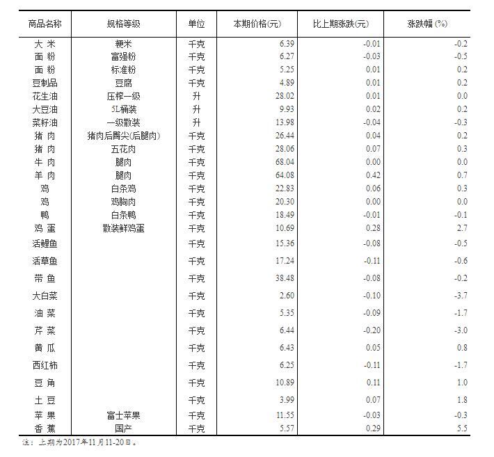 人民網(wǎng)北京12月4日電 據(jù)國(guó)家統(tǒng)計(jì)局網(wǎng)站消息,國(guó)家統(tǒng)計(jì)局今日公布50個(gè)城市主要食品平均價(jià)格變動(dòng)情況(2017年11月21-30日)。數(shù)據(jù)顯示在27種主要食品中,與11月中旬相比,大米、面粉、芹菜等12種食品價(jià)格下降,大豆油、羊肉等13種食品價(jià)格上漲,2種持平。其中,大白菜價(jià)格跌幅最大,為3.7%;香蕉價(jià)格漲幅最大,為5.5%。(朱江)