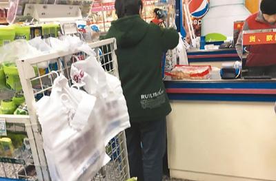 記者在北京市朝陽區(qū)多家超市走訪時發(fā)現(xiàn),幾乎每家超市在收銀處都掛著型號不同的塑料袋,這些塑料袋小號每個0.2元、大號每個0.3元。由于食品選購區(qū)的手撕式食品專用袋基本為免費(fèi)提供,因此幾乎每名顧客的購物籃里都裝著五六個這樣的塑料袋。