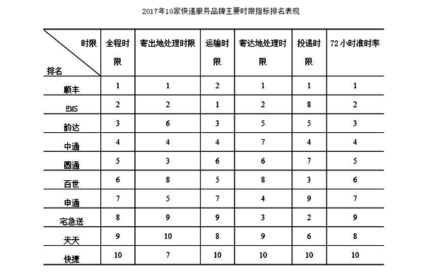 據(jù)了解,2017年快遞服務時限準時率測試范圍覆蓋50個城市,包括全部省會城市、直轄市以及19個快遞業(yè)務量較大的重點城市。測試對象為2016年國內(nèi)快遞業(yè)務量排名靠前且服務水平較好的10家全網(wǎng)型快遞服務品牌,包括:郵政EMS、順豐速運、圓通速遞、中通快遞、申通快遞、韻達快遞、百世快遞、天天快遞、宅急送快運和快捷快遞。