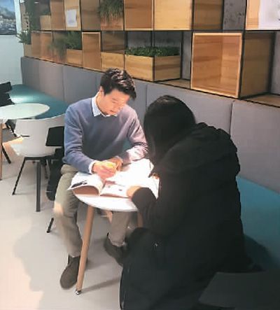 圖為陳戈(左)與同事探討關于留學生二手交易中存在問題的調研結果。