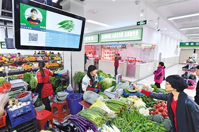 | 安徽省合肥市瑤海區(qū)勝利智能農(nóng)貿(mào)市場(chǎng),每個(gè)攤位都安裝了電子屏,只需掃碼即可實(shí)現(xiàn)移動(dòng)支付,還可在平臺(tái)對(duì)商家進(jìn)行點(diǎn)評(píng)、維權(quán)投訴等。掃碼“滴”聲之后,現(xiàn)實(shí)與虛擬被連接,這種黑白方格組成的“時(shí)代符號(hào)”(二維碼)帶來了便利、快捷和驚喜。 |