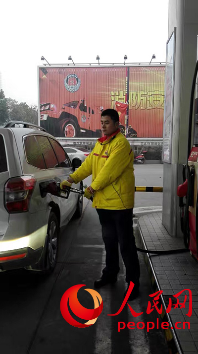 中國(guó)石油陜西安康銷(xiāo)售分公司三橋加油站工作人員正在給私家車(chē)加油。(人民網(wǎng) 朱江 拍攝)