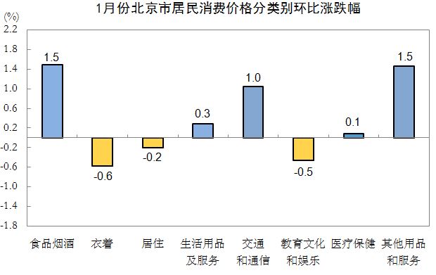 1月份,北京市居民消費價格總水平環(huán)比上漲0.4%。其中,食品價格上漲2.0%,非食品價格上漲0.1%;消費品價格上漲0.6%,服務(wù)價格上漲0.1%。