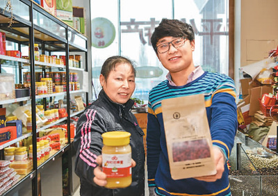 | 大學(xué)畢業(yè)后回到家鄉(xiāng)創(chuàng)辦電商公司的張偉和母親在新疆精河縣線下實(shí)體店展示自家出售的特產(chǎn)。 |