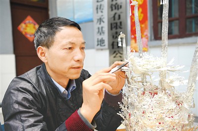 今年52歲的貴州省臺江縣施洞鎮(zhèn)崗黨略村塘龍寨苗族工匠吳水根,從事苗族銀飾加工30余年。其加工的銀飾造型具有鮮明的民族特色和地域特色。2012年,吳水根被評為第四批國家級非物質(zhì)文化遺產(chǎn)項目名錄《銀飾鍛制技藝(苗族銀飾鍛制技藝)》代表性傳承人。圖為3月2日,吳水根在院子里制作銀帽。FdJ安康新聞網(wǎng)