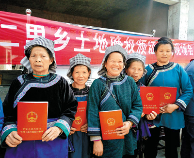 圖為3月14日,在貴州省榕江縣仁里鄉(xiāng)黨民村舉行的土地確權(quán)頒證儀式上,當?shù)貗D女領(lǐng)到《農(nóng)村土地承包經(jīng)營權(quán)證》。Jpx安康新聞網(wǎng)