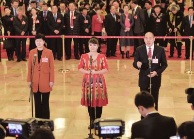 3月20日8:05-8:45(大會(huì)閉幕會(huì)前)在人民大會(huì)堂中央大廳北側(cè)舉辦第五場(chǎng)“代表通道”集中采訪活動(dòng),邀請(qǐng)9名全國人大代表接受采訪。圖為全國人大代表張全收(右)、如克亞木·麥提賽地(中)、馬恒燕(左)在回答記者提問。本報(bào)記者戴軍攝